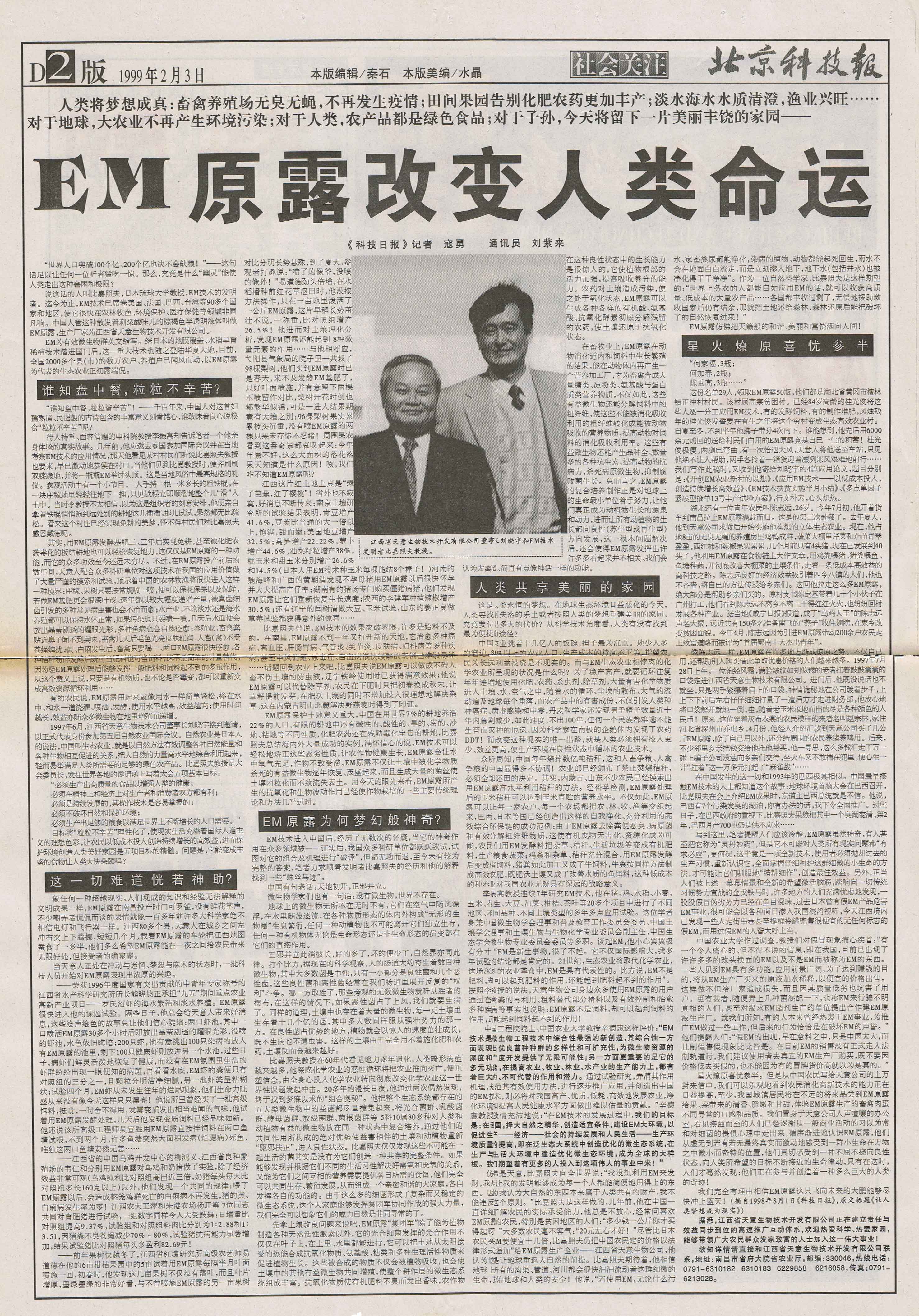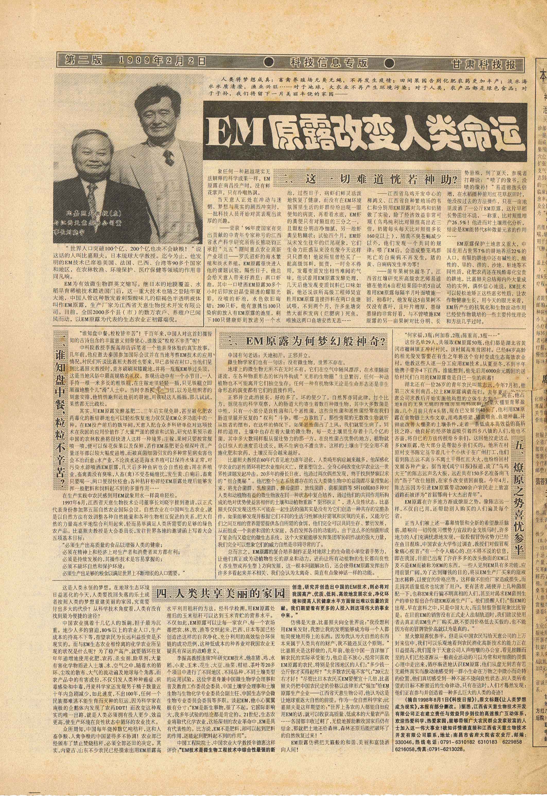 1997年,継《中國畜牧水產(chǎn)報》、《科技日報》、《經(jīng)濟(jì)參考報》、《江西日報》等媒體發(fā)表長篇通訊《EM原露正在改變世界》,各省科技、農(nóng)業(yè)報刋均紛紛轉(zhuǎn)載,EM原露在江西最初的使用效果迅速在全國范圍內(nèi)興起了一股熱潮,兩年內(nèi)共簽定縣級代理合同500余家。